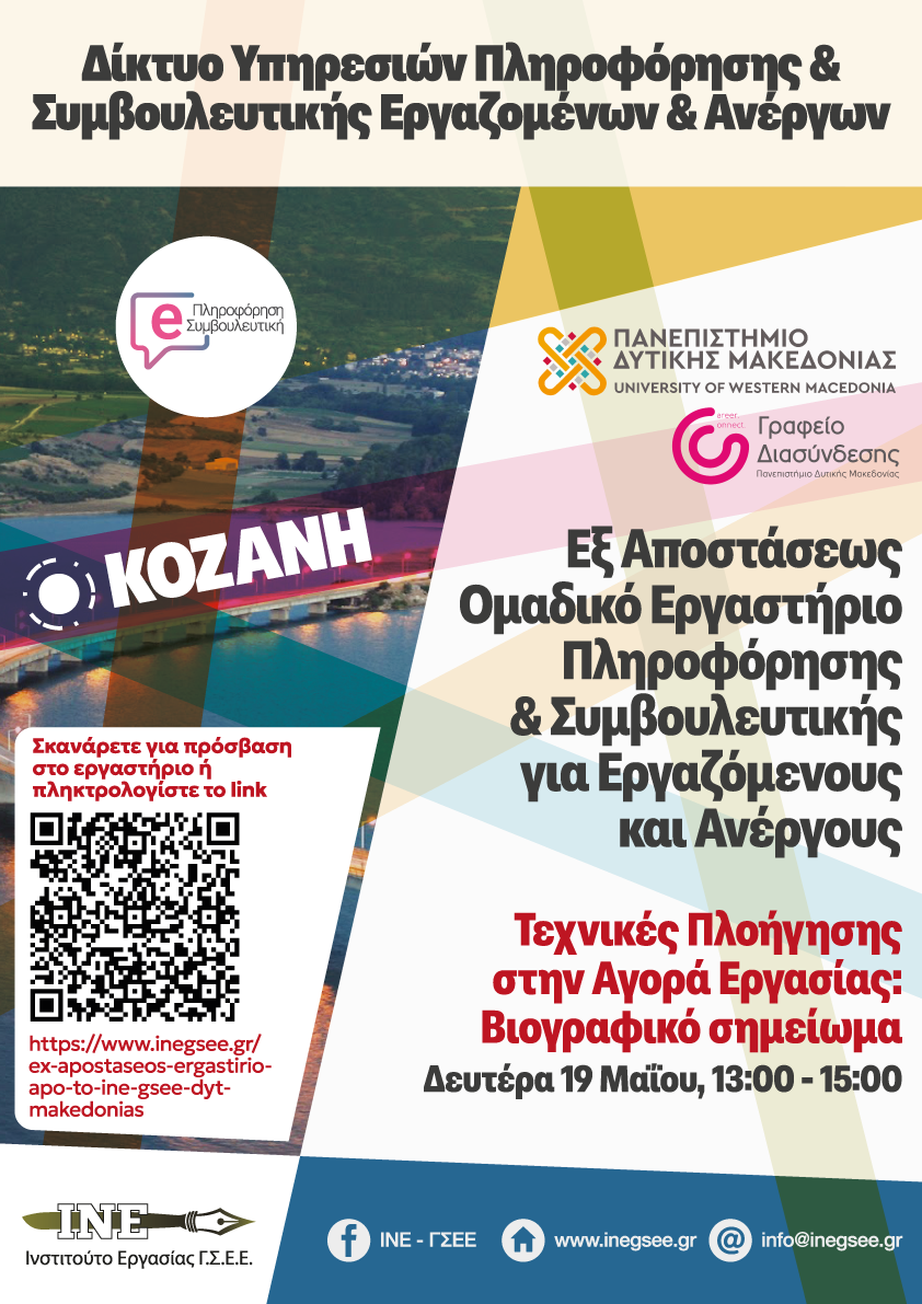 το Γραφείο Διασύνδεσης του ΠΔΜ σε συνεργασία με το Περιφερειακό ΙΝΕ – ΓΣΕΕ Δυτ. Μακεδονίας / Κοζάνης διοργανώνουν ΔΙΑΔΙΚΤΥΑΚΟ Εργαστήριo Συμβουλευτικής Πληροφόρησης με θέμα “Τεχνικές Πλοήγησης στην Αγορά Εργασίας: Βιογραφικό σημείωμα”, την Δευτέρα 19 Μαΐου 2025 και ώρα 13:00 – 15:00, με εισηγητή τον κ. Νίκο Πατσέλη.
